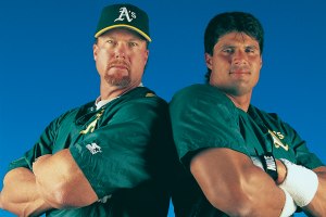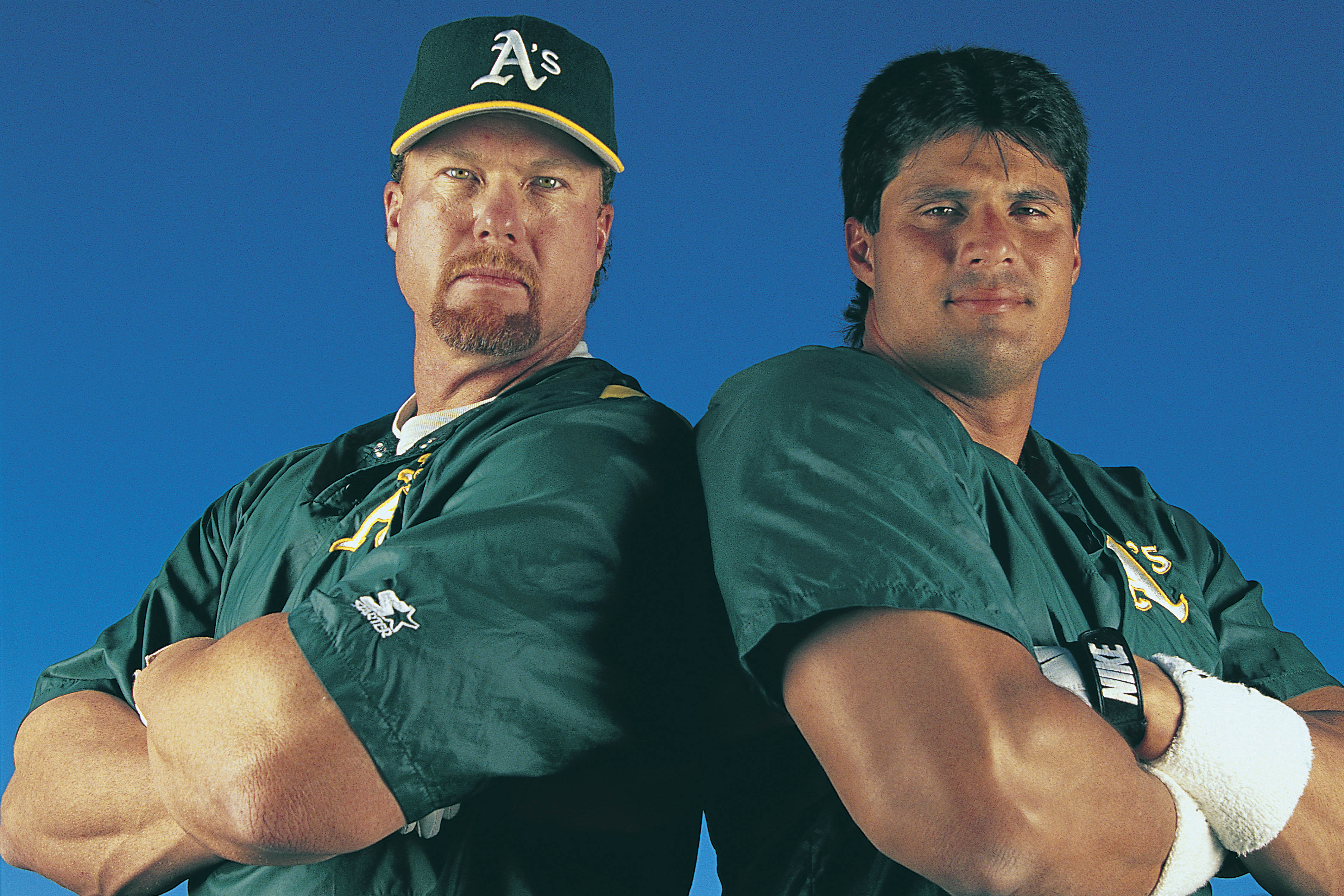 1997: Mark McGwire, left and Jose Canseco of the Oakland Athletics poses for the camera during a photo shoot. (Photo by Albert Dickson/Sporting News via Getty Images)